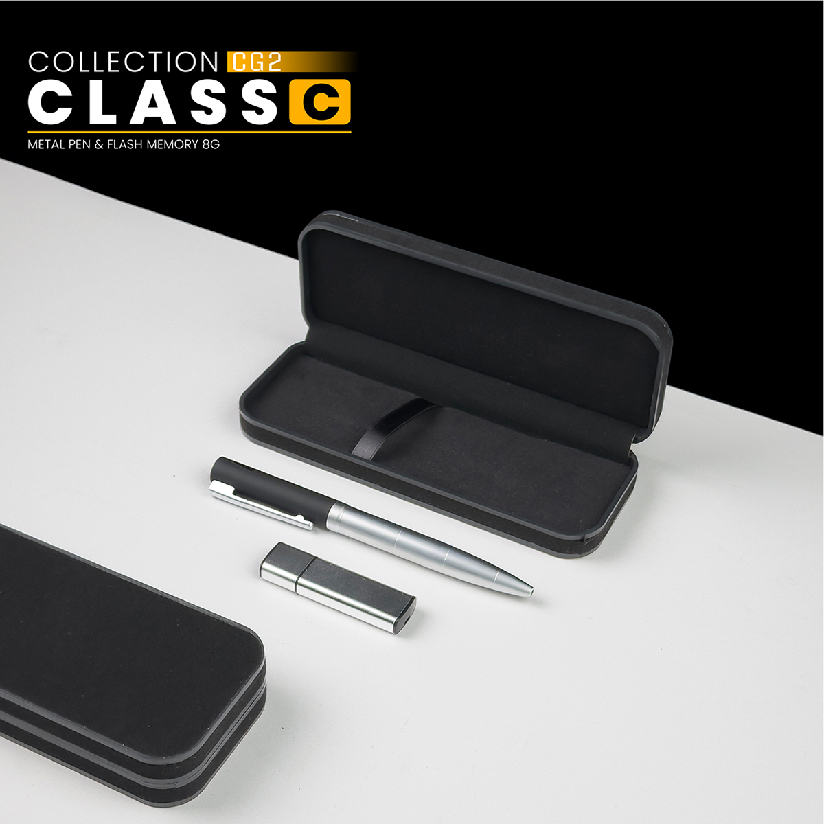Pen: Metallic Executive Pen Flash Memory: 8GB USB Drive Packaging: Hard Presentation Case with Soft Interior